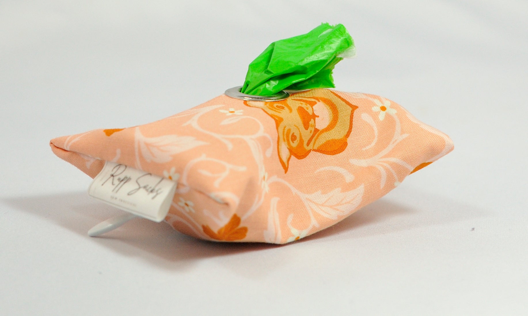 Clip on pet waste bag dispensers. These bags have a zipper enclosure to easily refill bags. On the other side is a grommet opening dispensing bags. Cute dog-themed fabrics.